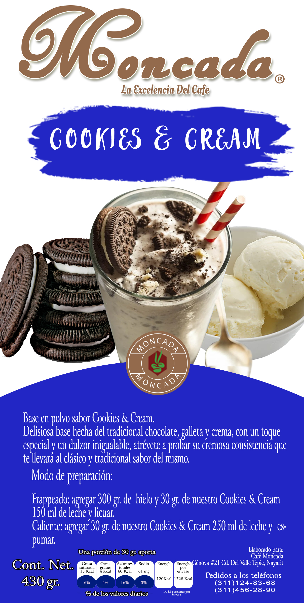 Cookies And Cream (1.296Kg.) Base en polvo sabor Cookies And Cream. Deliciosa base hecha del tradicional chocolate, galleta y crema con un toque especial y un dulzor inigualable, atrévete a probar su cremosa consistencia que te llevará al clásico y tradicional sabor del mismo. Frío: Agregar 300 gramos de hielo, 30 gramos de nuestro Cookies And Cream y 150ml de leche, después licuar. Caliente: Agragar 30 gramos de nuestro Cookies And Cream y 250 ml de leche y espumar Precio: $# |