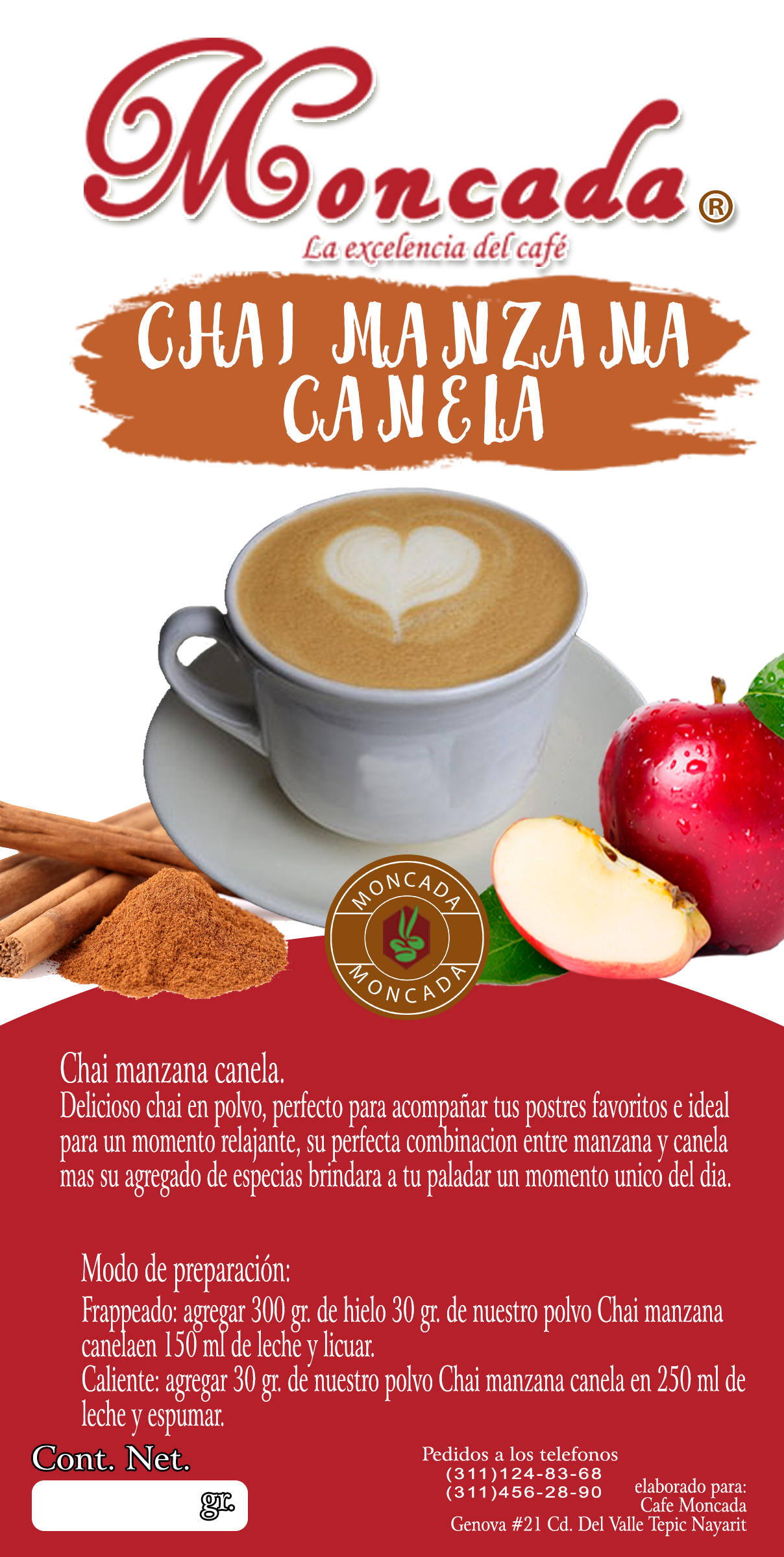 Chai manzana-canela(1.296Kg.)Delicioso Chai en polvo perfecto para acompañar tus postres favoritos e ideal para un momento relajante, su perfecta combinación de manzana con canela más el agregado de especias brindara a tu paladar un momento único del día. Precio: $# |