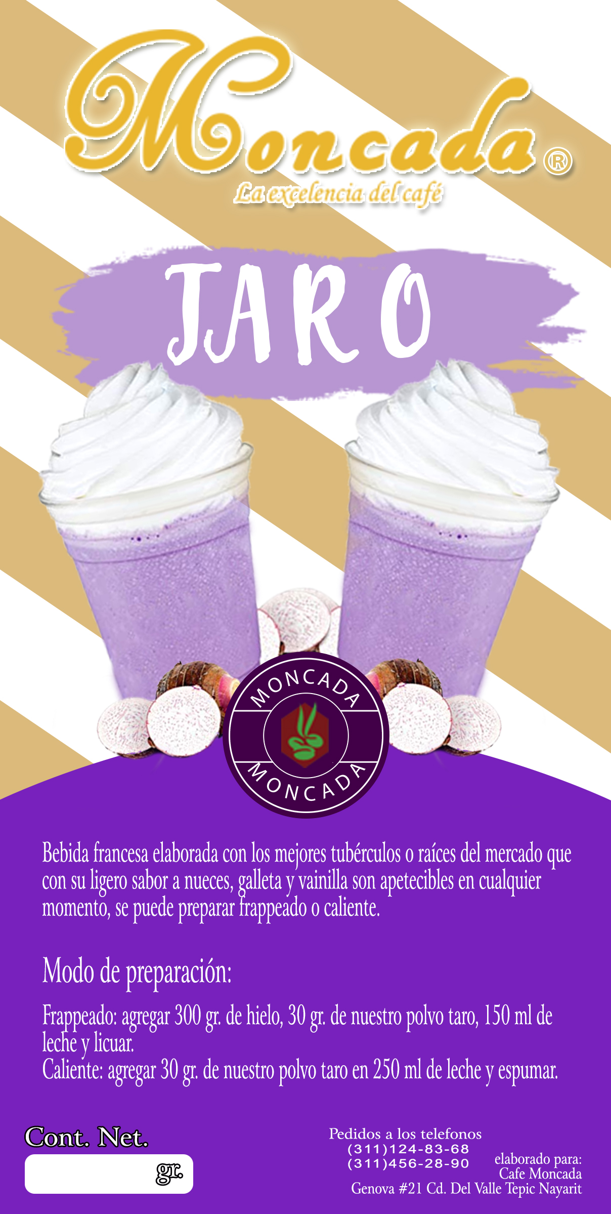 Taro (1.296Kg.) Bebida francesa elaborada con los mejores tubérculos o raíces del mercado, que con su ligero sabor a nueces, galleta y vainilla son apetecibles en cualquier momento. Se puede preparar frío o caliente. Frío: Agregar 300 gramos de hielo 30 gramos de nuestro polvo taro y 250ml de leche, después licuar. Caliente: Agregar 30 gramos de nuestro polvo taro en 250 ml de leche y espumar. Precio: $# |