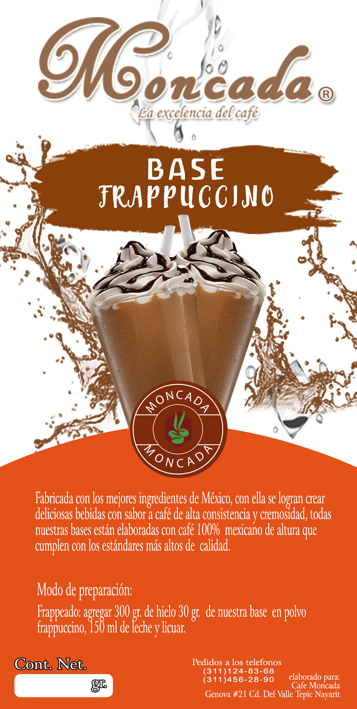 Base en Polvo para Frappucino (1.296Kg.)Fabricada con los mejores ingredientes de México, con ella se logran crear deliciosas bebidas con sabor a café, de alta consistencia y cremosidad todas nuestras bases están elaboradas con café 100% mexicano de altura, que cumplen con los estándares más altos de calidad Frio: agregar 300 gramos de hielo, 30 gramos de nuestra Base en Polvo Frappuccino y 250ml de leche, después licuar. Precio: $# |