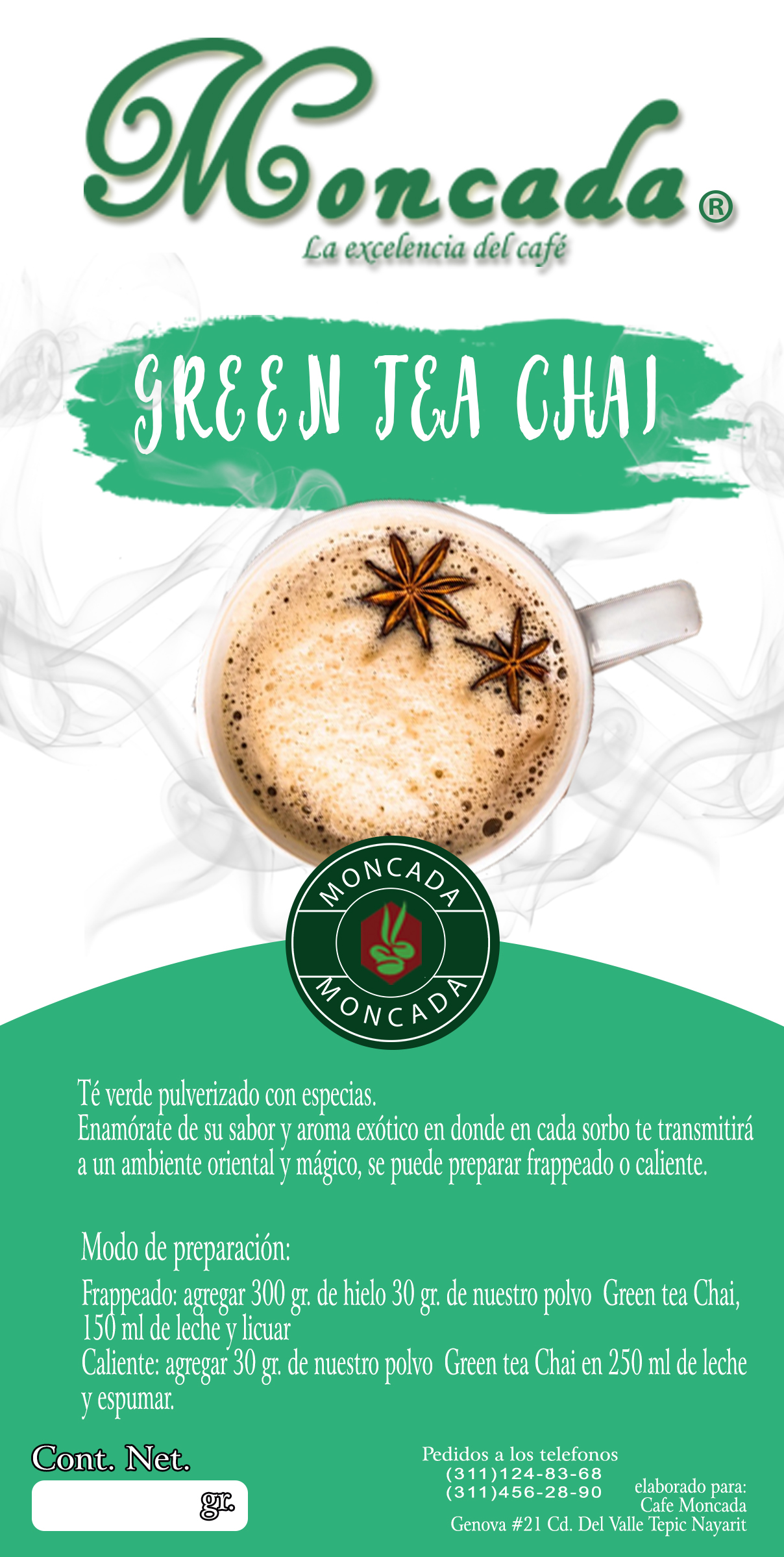 Chai Green Tea (1.296 Kg.) Té verde pulverizado con especias. Enamórate de su sabor y aroma exótico que, en cada sorbo, te transmitirá un ambiente oriental y mágico. Se puede preparar frío o caliente. Frío: Agregar 300 gramos de hielo, 30 gramos de nuestro polvo Chai Green Tea y 250ml de leche, después licuar. Caliente: Agregar 30 gramos de nuestro polvo Chai Green Tea en 250 ml de leche y espumar. Precio: $# |