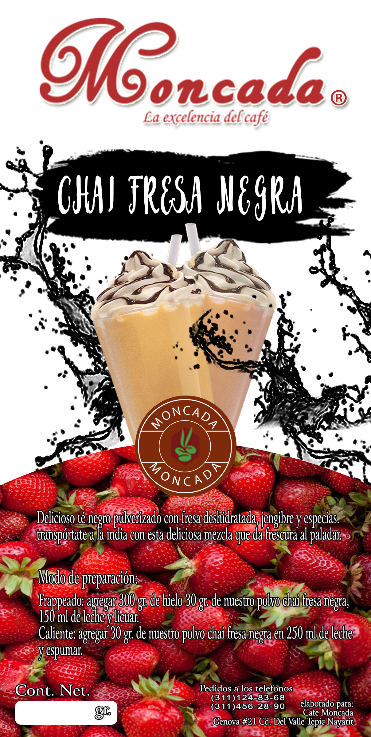 Chai Fresa Negra (1.296Kg.) Delicioso té negro pulverizado con fresa deshidratada, jengibre y especias. Transpórtate a la India con esta deliciosa mezcla que da frescura al paladar, se puede preparar frío o caliente. Frío: Agregar 300 gramos de hielo, 30 gramos de nuestro polvo Chai Fresa Negra y 250ml de leche, después licuar. Caliente: Agregar 30 gramos de nuestro polvo Chai Fresa Negra en 250 ml de leche y espumar. Precio: $# |