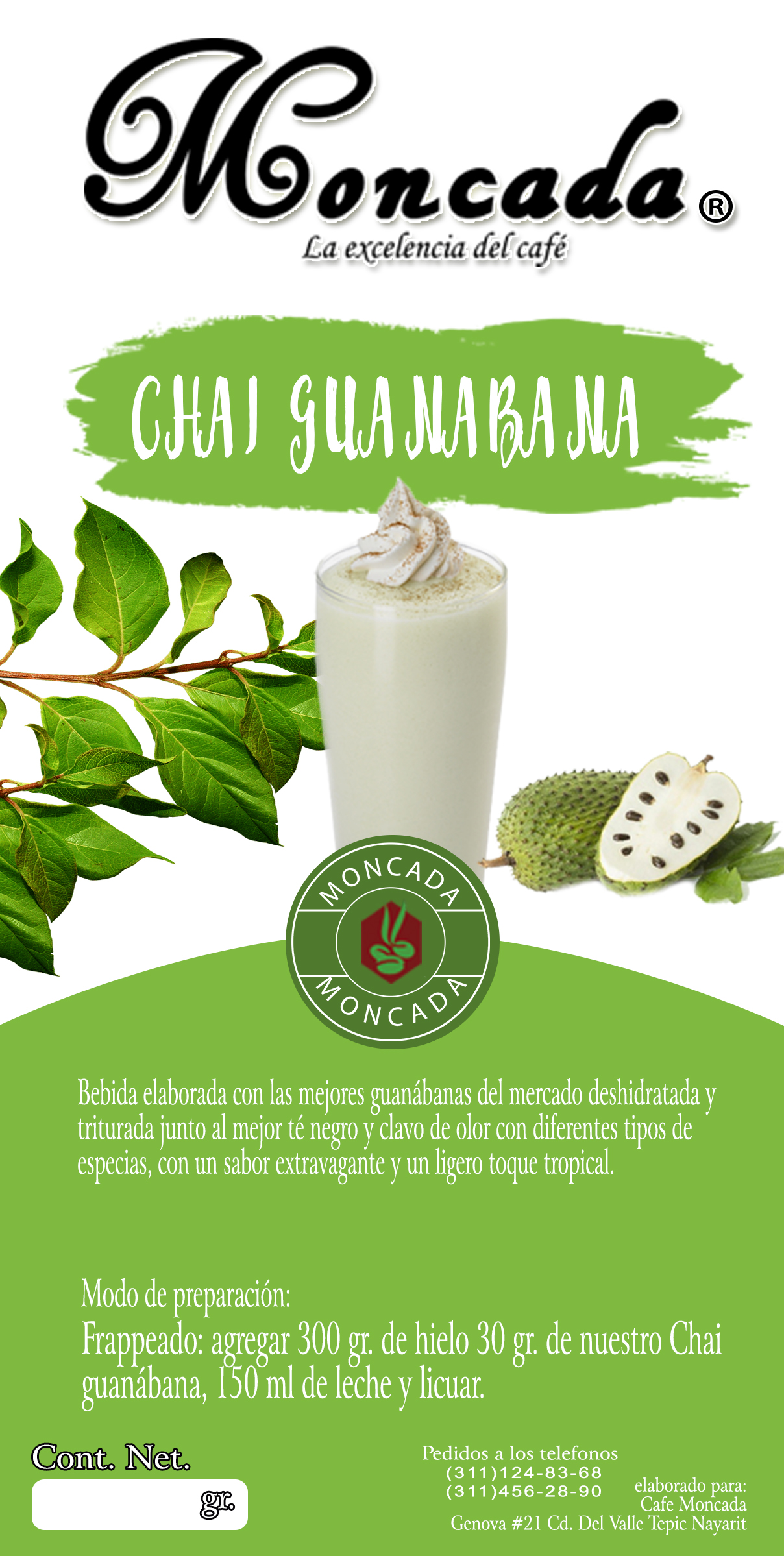Chai Guanábana (1.296Kg.) Bebida elaborada con las mejores guanábanas del mercado. Deshidratada y triturada junto al mejor té negro y clavo de olor con diferentes tipos de especias, con un sabor extravagante y un ligero toque tropical. Se recomienda solo preparar en frío para obtener los mejores sabores. Frío: Agregar 300 gramos de hielo, 30 gramos de nuestro Chai Guanábana y 250ml de leche, después licuar. Precio: $# |