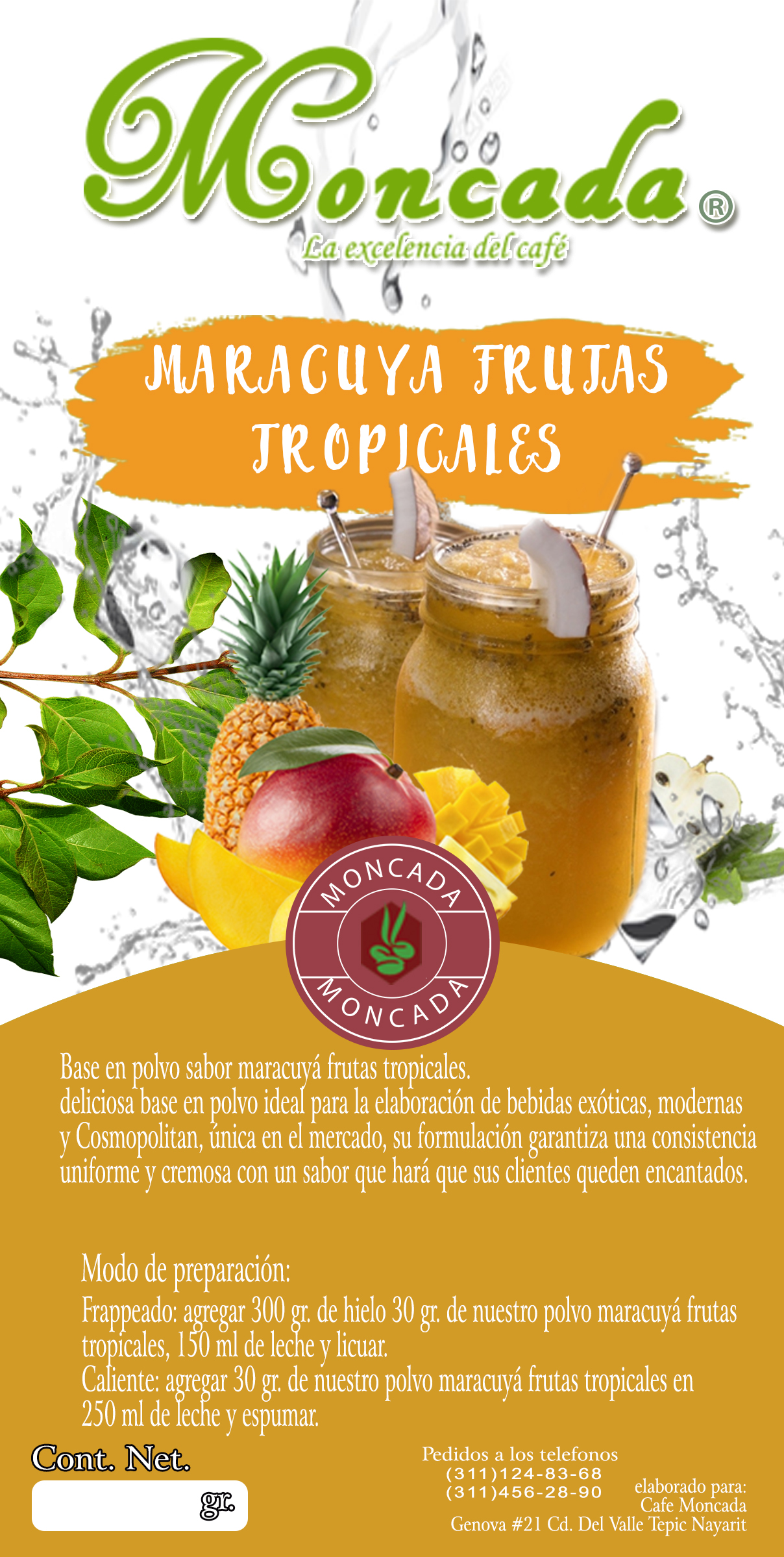 Base en Polvo sabor Maracuyá, Frutas Tropicales (1.296Kg.) Deliciosa base en polvo ideal para la elaboración de bebidas exóticas, modernas y Cosmopolitan, única en el mercado para frías o calientes. Su formulación garantiza una consistencia uniforme y cremosa, con un sabor que hará que sus clientes queden encantados. Frio: Agregar 300 gramos de hielo, 30 gramos de nuestra Base en Polvo sabor Maracuyá y Frutas Tropicales y 250ml de leche, después licuar. Caliente: agregar 30 gramos de nuestro polvo taro en 250 ml de leche y espumar. Precio: $# |