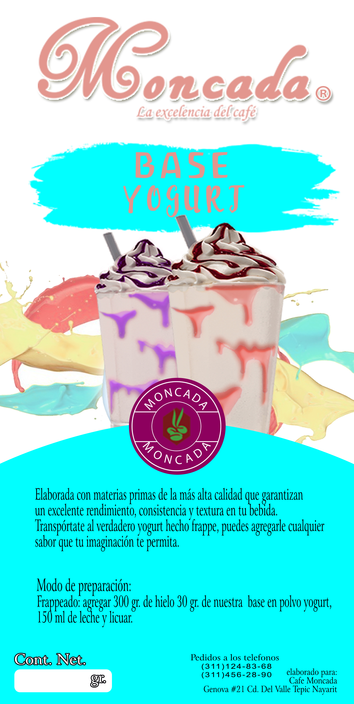 Base en Polvo sabor Yogurth (1.296Kg.) Elaborada con materias primas de la más alta calidad, un excelente rendimiento, consistencia, y textura en tu bebida. Transpórtate al verdadero yogurt hecho frappe, puedes agregarle cualquier sabor que tu imaginación te permita. Frío: agregar 300 gramos de hielo, 30 gramos de nuestra Base en Polvo sabor Yogurt y 250ml de leche, después licuar. Precio: $# |