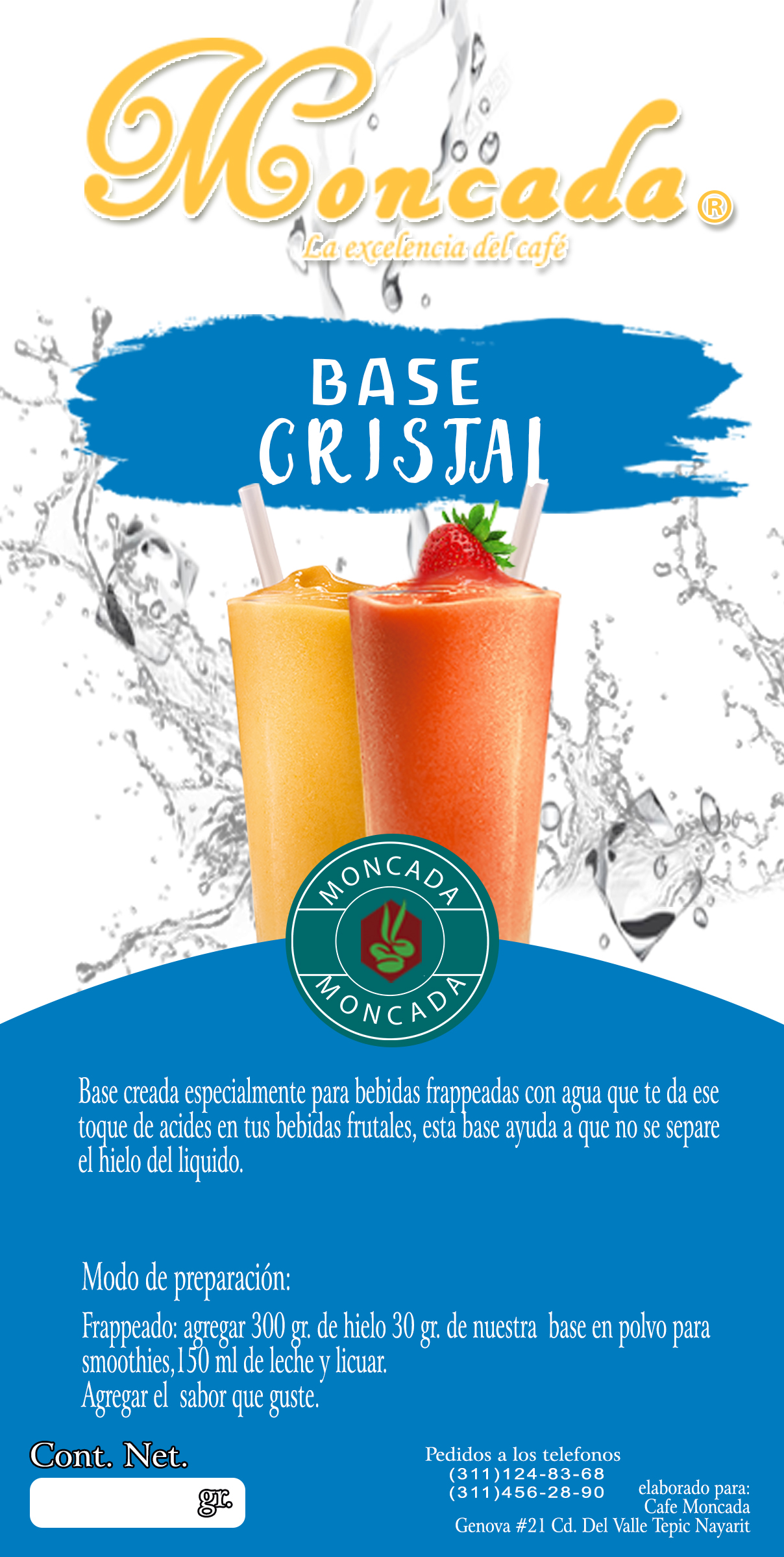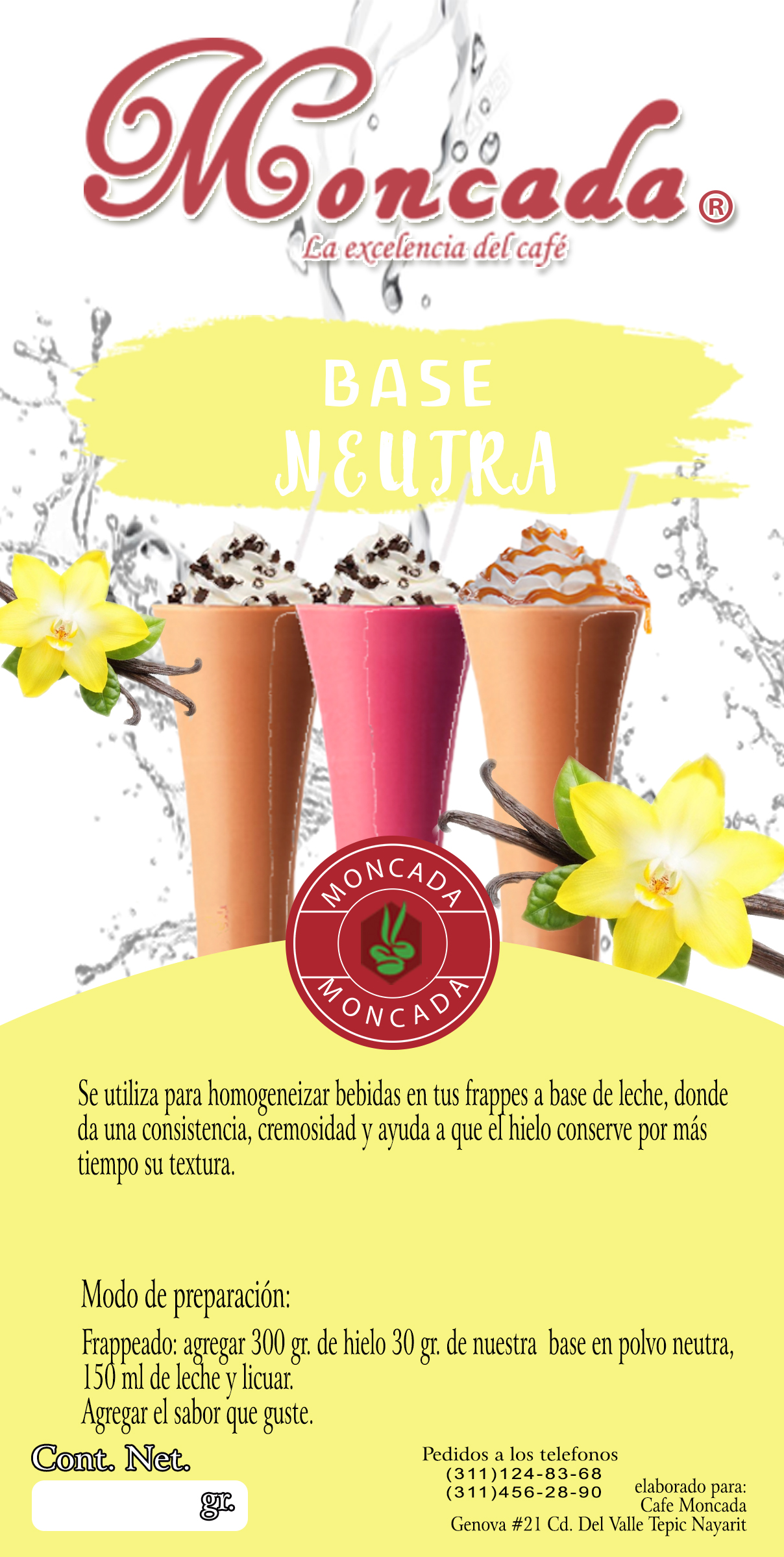 Base en Polvo Neutra (1.296Kg.) Se utiliza para homogeneizar bebidas en tus frappes a base de leche, donde le da una consistencia, cremosidad, y ayuda a que el hielo conserve por más tiempo su textura. Frío: Agregar 300 gramos de hielo, 30 gramos de nuestra Base en Polvo Neutra y 250ml de leche, después licuar. Agregue el sabor que guste. Precio: $# |